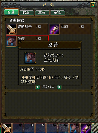 点击右下角技能按键或快捷键S,出现技能界面。在普通技能中,选择坐骑技能,将其拖拉到中下方快捷栏中。