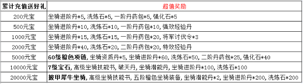 活动内容:活动期间,累计充值达到指定金额即可领取相应超值奖励。