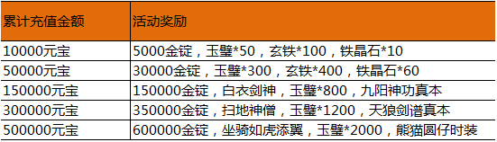 活动内容:活动期间,游戏内充值活动,玩家单笔充值一定金额,即可获得相应的充值金锭返利.