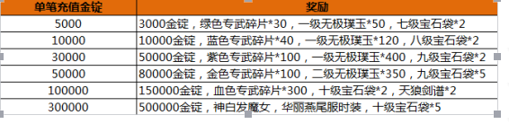 活动内容:活动期间,游戏内充值活动,玩家单笔充值一定金额,即可获得相应的充值金锭返利.