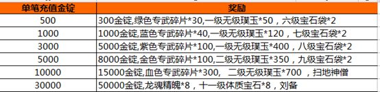 活动内容:活动期间,游戏内充值活动,玩家单笔充值一定金额,即可获得相应的充值奖励。