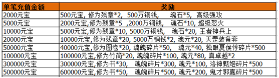 活动内容:开服期间单笔充值大返利活动(可以重复充值重复领取)