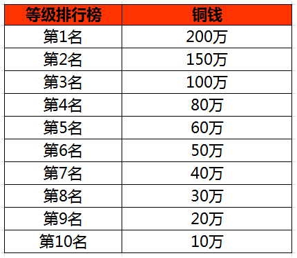 活动内容:开服活动期间,排行榜前十玩家可获得额外铜钱奖励
