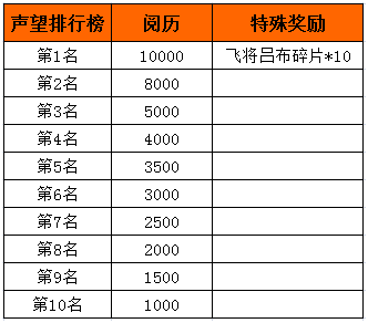 活动内容:开服活动期间,排行榜前十玩家可获得额外奖励。(开服连续7天声望榜第一的玩家,可获得全服唯一的超级伙伴——飞将吕布)
