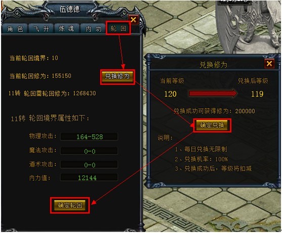 3、 兑换成功后,玩家等级将扣减(注:每级兑换轮回修为20W)
