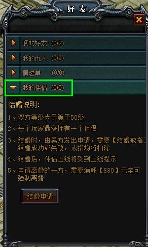 在主界面“好友”系统中,“我的伴侣”分项中可查看结婚条件。
