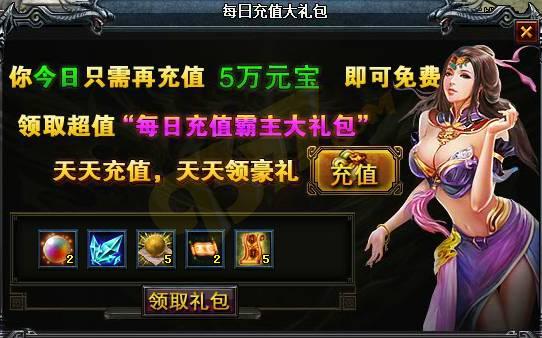 每日充值达10W元宝时,即可领取霸主级大礼包(注:在界面“每日首充”图标中,逐一领取礼包)
