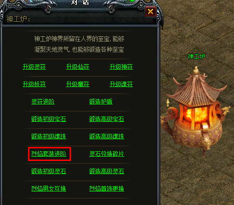 在沙漠土城“神工炉”处可进行【圣】烈焰首饰的升级(如下图)