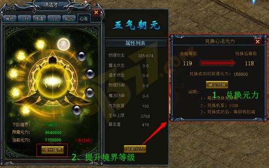 1、在心法界面上,等级达110以上时,可牺牲等级兑换心法元力