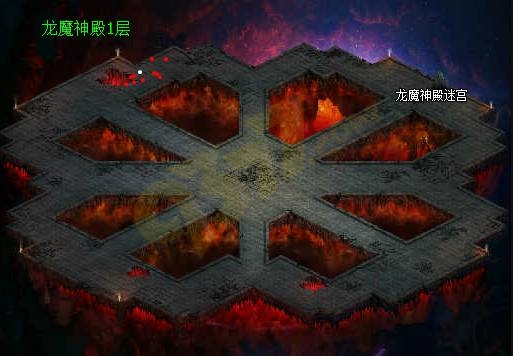 3、龙魔神殿第1层为大厅,第3层为BOSS层,第2层为迷宫,迷宫分5间,每间均有4个传送口,进入其中将随机传送至5间迷宫之一