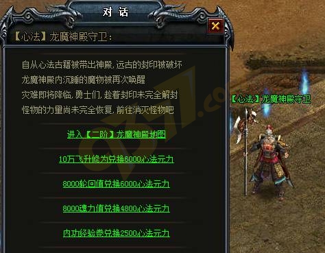 4、心法达[两仪向心]境界时,可在[沙漠土城]NPC龙魔神殿守卫处,进入龙魔神殿地图,地图难度较高,建议组队前往