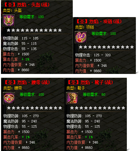 【圣】烈焰武器衣服系列属性详情:(如下图)