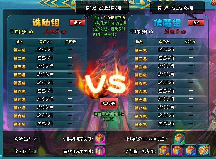 2.玩家通过“争当劳模”图标进入选择诛仙或者伏魔组,加入后个人积分将累计到小组积分。
