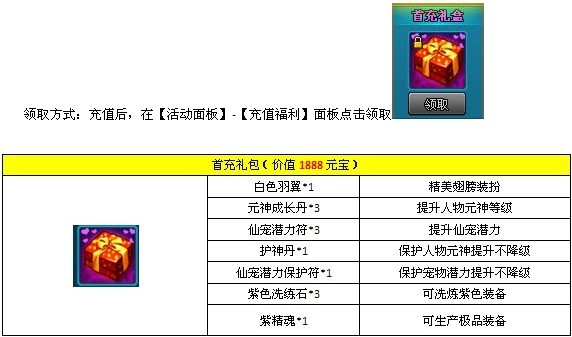 活动规则:从开服当日起,只要玩家的角色是第一次在所在服务器进行充值,不限制任何金额,除了能获得相应的元宝之外,还都将会获得一份“首充礼盒”。
