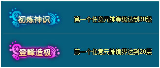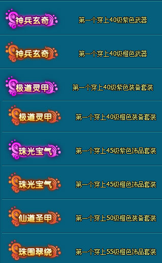 | 声名鹊起 | 一级暴击石*1;一级攻击石*1;金条*10;紫精魂*1;传音符*10, 铜钱卡*10;紫色洗炼石*3;初级强化仙玉*1;四级星辰石*3;修为丹*5 |