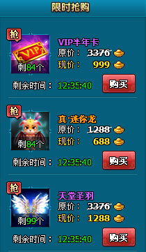 VIP半年卡只要999元宝/张 真•迷你龙只要688元宝/个 紫色神装宝盒只要688元宝/个 |