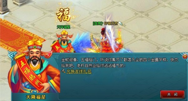 2.玩家收集完整的四个字后可以去活动NPC天降福星处兑换【蛇年吉祥礼包】1份。