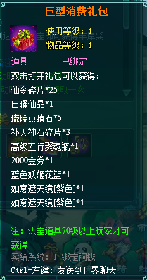 1, 消费礼包中的法宝道具等级70级以上玩家才可获得。