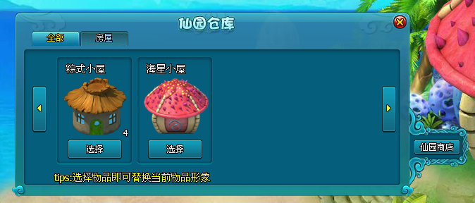 2. 选择房屋:购买房屋后,可在仙园仓库选择需要的房屋;