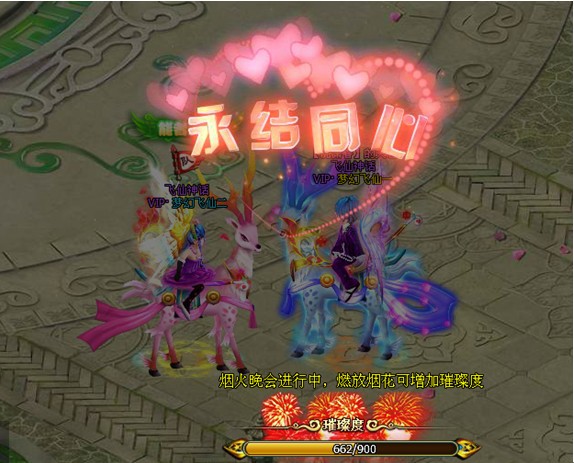 活动期间,每日第一次送花,无尽试炼、镇妖塔与洛水龙宫掉落获得【七夕烟火】。使用【七夕烟火】将绽放绚烂的烟花效果,并且获得20000经验。活动期间每日21:00至21:30期间将在洛水城许愿池旁举办烟花晚会,玩家在此期间每燃放一个【七夕烟火】,将会增加2点全城璀璨度. 全城璀璨度满了1200之后,全服在线的40级以上玩家将会获得【璀璨礼包】*1。当玩家燃放【七夕烟火】超过10次,将会获得七夕浪漫礼包*1,本奖励每日最多只能获取1次。除此之外,烟花晚会期间当21:05、21:10、21:15、21:20、21:25、21:29时,将会在许愿池场景出现【圣光宝盒】,所有40级以上玩家均可采集宝盒,每个玩家单天最多可拾取10个【圣光宝盒】。