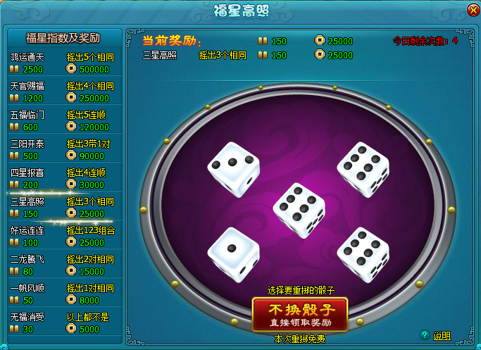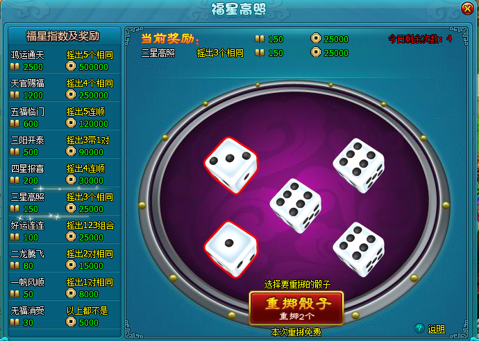 3. 如果你对当前奖励不满意,可以选中要重掷的骰子进行重掷(每局前2次重掷免费哦)