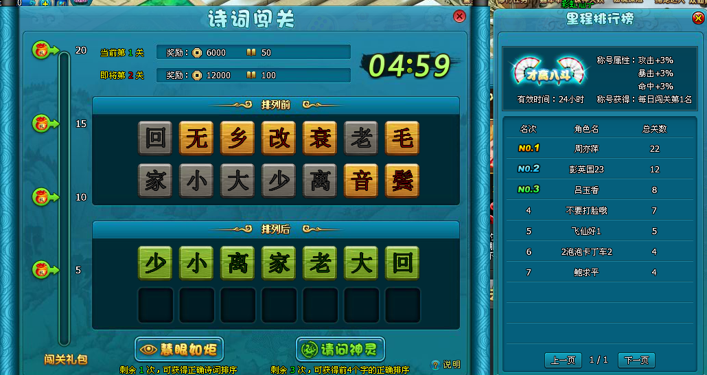 3.开始闯关后,点击诗词进行排序,排序正确则闯关成功进入下一关。