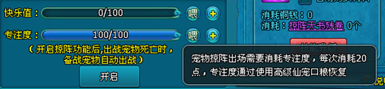 5.掠阵出场的宠物需要消耗专注度,专注度通过使用高级仙宠口(商城购买)粮来恢复。
