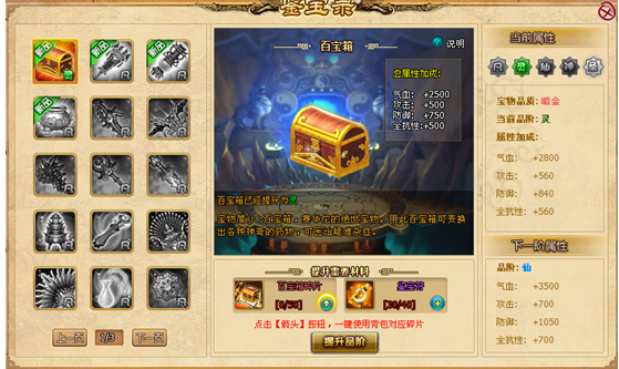 2. 提升宝物品质,可永久增加人物气血,攻击,防御,全抗等珍贵属性。