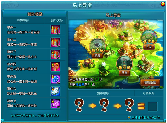 3.每次寻宝都会自动重新刷新寻宝地图(主动刷新地图需消耗1个寻宝刷新令或10元宝),当连续3次寻宝地图组成相关特殊事件时,便可获得该事件对应的珍贵额外奖励。