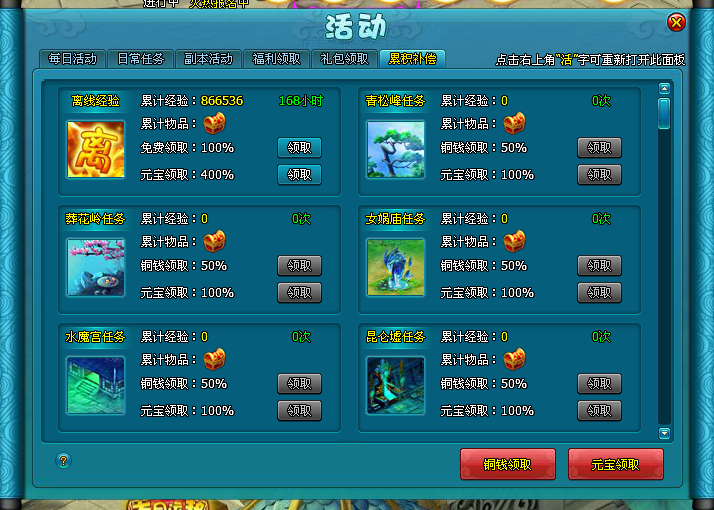 点击右上角“活”字,即可打开面板累积补偿哦!玩家可以选择花费铜钱或元宝挽回损失。