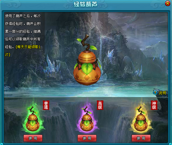 概述:还为升级慢而苦恼吗?经验葫芦帮你忙哦!使用经验葫芦后,玩家每次获得经验,经验葫芦都会累积储存一些哦,直到经验储满,玩家就可以领取经验葫芦里的经验了哦!(点击界面上方经验葫芦图标即可打开经验葫芦面板)