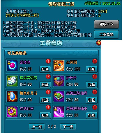 工资可兑换火凤羽,护神丹,水月石,坐骑进阶仙丹,玄武仙玉,灵器进阶仙玉,五灵珠,时装升星石,八门保护符,封灵阵进阶卷等珍稀物品!(点击右上角活----福利领取,可打开在线兑换工资面板)