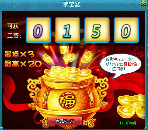2.打开福利加油站---聚宝盆,消耗一张聚宝符和50元宝,有机会获得最低3倍,最高20倍的工资奖励哦!