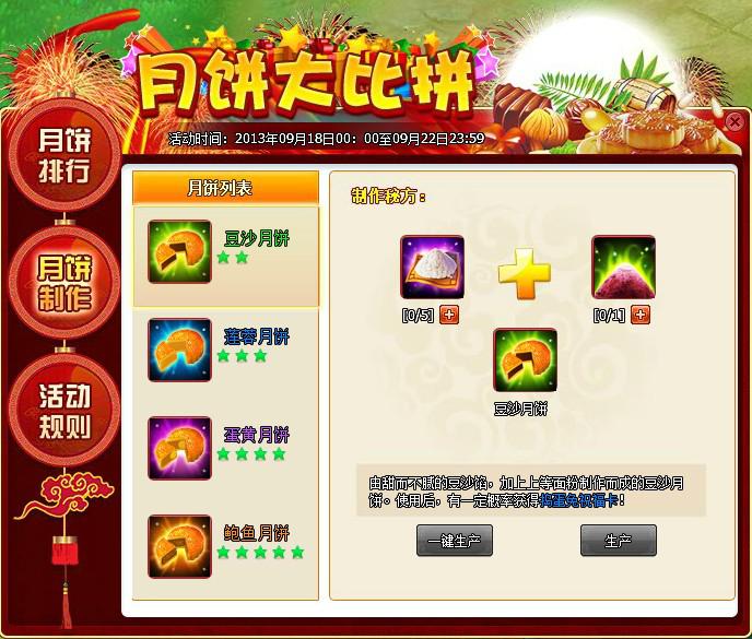 ①活动期间,参与洛水龙宫、镇妖塔、无尽试炼副本与击杀狂暴月饼怪有机会获得月饼材料。集齐材料后可制作各口味月饼。