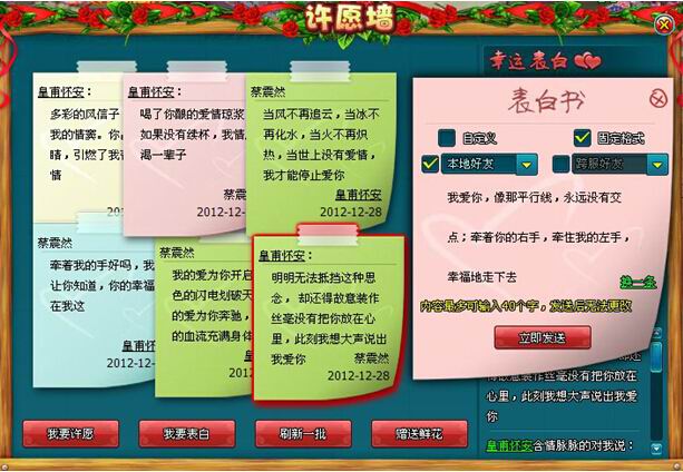 ② 玩家还可以在许愿墙上查看其他玩家写下的表白和愿望,假若被某条表白感动,你还可以向该表白者送花表示祝福。