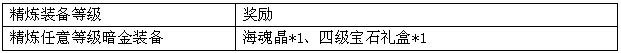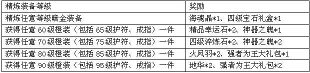 活动规则:活动期间,玩家通过橙装精炼获得任意一件橙装(包括橙色武器)或精炼成功任意暗金装备,即可获得系统奖励一份。