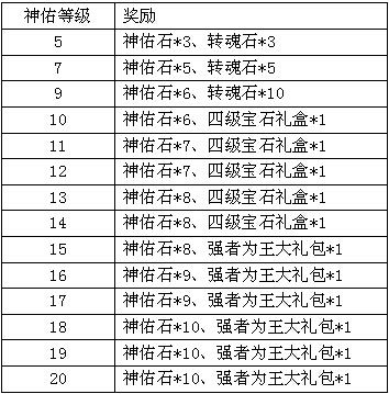 活动规则:活动期间,将任意装备神佑提升到指定等级,可获得额外系统赠礼。