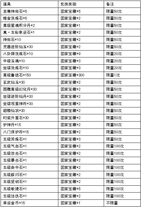 兑换列表如下: