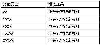 活动期间,玩家充值至指定额度,即可获得对应的元宝转盘符,使用元宝转盘符转动转盘,将可随机获得转盘上任意额度的元宝奖励。每个额度转盘只能转一次,每一轮转完之后将开启下一轮转盘。元宝转盘升级后,最高可累计获得30520非绑定元宝返利哦!