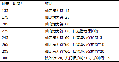 仙宠潜力金丹*3、八门金丹*70、八门保护符*70、护神丹*60、完美幸运石*2、高级鲁班石*30 |