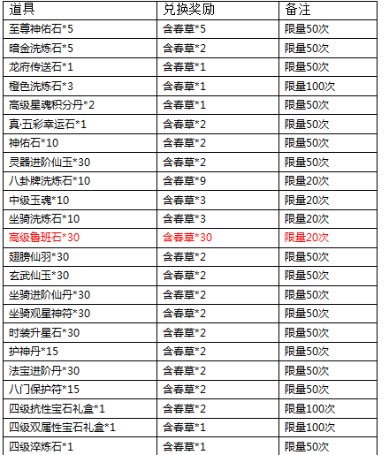 七星剑之魂*120/射日弓之魂*120/神农杖之魂*120/霸王戟之魂*120/高级星魂积分丹*45/法宝进阶丹*150/翅膀仙羽*150/坐骑进阶仙丹*150/仙宠成长丹*150/灵器进阶仙玉*120/玄武仙玉*120/图腾高级幻化丹*120/仙宠神级技能书兑换令*1/红色命格礼包*1 |