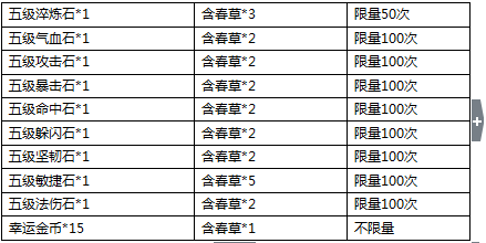 真·四级宝石礼盒*10、五级淬炼石*1、洗炼锁*60、中级玉魂*30、八卦牌洗炼石*15 |