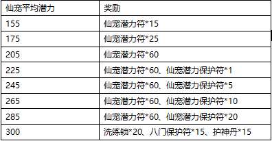 仙宠潜力金丹*3、八门金丹*70、八门保护符*70、护神丹*60、完美幸运石*2、高级鲁班石*30 |