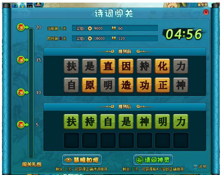 ②点击“排序前”诗词将其排列好,即为闯关成功并进入下一句诗词的闯关,过程中可使用“慧眼如炬”(只能用1次)和“请仙问灵”(只能用3次)两种锦囊;