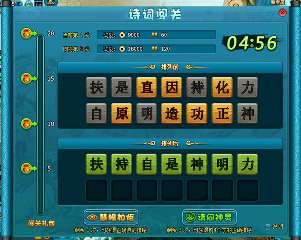 ②点击“排序前”诗词将其排列好,即为闯关成功并进入下一句诗词的闯关,过程中可使用“慧眼如炬”(只能用1次)和“请仙问灵”(只能用3次)两种锦囊;