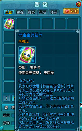 玩家可以使用【粽宝宝祝福卡】对其好友进行祝福,祝福之后其好友仙宠将化身为可爱的棕宝宝(只能祝福别人,不能对自己的宠物进行变身)。被祝福之后,不仅 自己仙宠形象改变,人物基础气血、基础攻击也将分别增长5%,持续时间为15分钟。祝福卡使用之后,发起祝福与被祝福者双方均可获得20000经验。活动 过后,【粽宝宝祝福卡】将会消失。