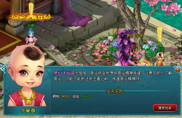 活动期间内,40级以上玩家每天第一次登陆,即可获得梦幻飞仙给您准备的【迎奥运登陆礼包】,打开礼包,可获得【圣火种子】*1,气血包*1,坐骑进阶灵丹*1,绑定铜钱卡*2,仙宠口粮*5。
