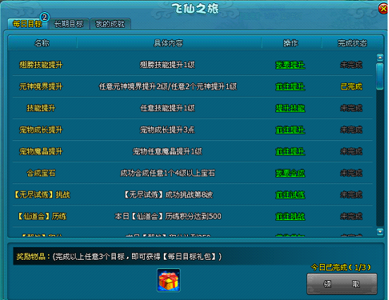1.每天玩家会有10个目标,只要任意完成其中3个目标即可领取【每日目标大礼包】