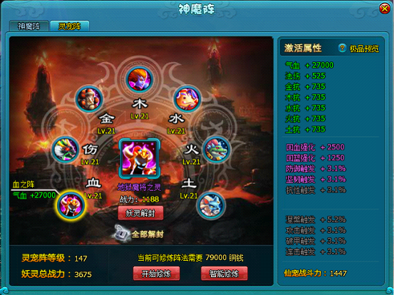 (1)在灵宠阵中拥有七个阵眼,每个阵眼对应一条基础属性,当阵眼中存在妖灵时,即可激活对应的基础属性。即气血、法伤以及五行抗性。基础属性高低与对应阵眼等级有关。