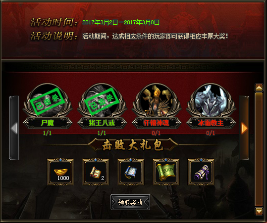 全名BOSS活动分为四挡,活动期间玩家击败相应的BOSS,可领取大量绑定元宝、金币以及极品装备